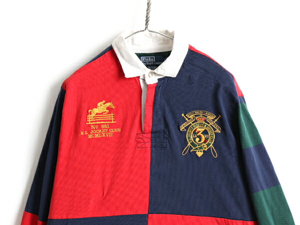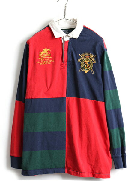 右胸にジョッキー刺繍、左胸にエンブレム刺繍 バックにはビッグパネル ナンバーパッチ刺繍入り なかなか見かけない、パネル切替と ワイドボーダー クレイジーパターンの切替デザイン 本格的なラガーシャツ同様のしっかりとした作り ラルフローレンらしいスタイリッシュさもある商品です。