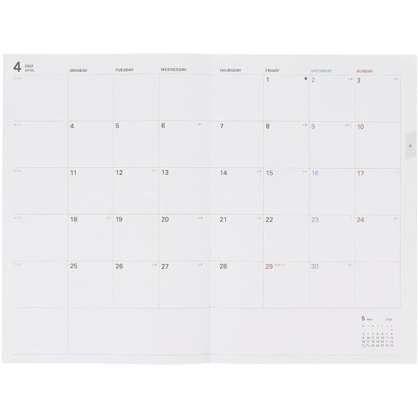 手帳本体 サイズ 手帳本体 仕様 本体サイズB6変型(180×120mm) ページ数176ページ 仕様糸かがり綴じ 本文用紙オリジナル手帳用紙 NEO AGENDA(森林認証紙) 生産国日本製 レイアウト3月始まり/月曜始まり 月間ページブロックタイプ 月間ページ掲載期間2022年3月〜2023年4月 掲載内容 月間ページ大安・仏滅・友引表示、ムーンカレンダー表示、ウィークナンバー、マンスリーメモ28ページ その他2022/2023/2024見開きカレンダー、年間カレンダー、方眼罫ノートページ113ページ、ID&PASSWORD、パーソナルデータ