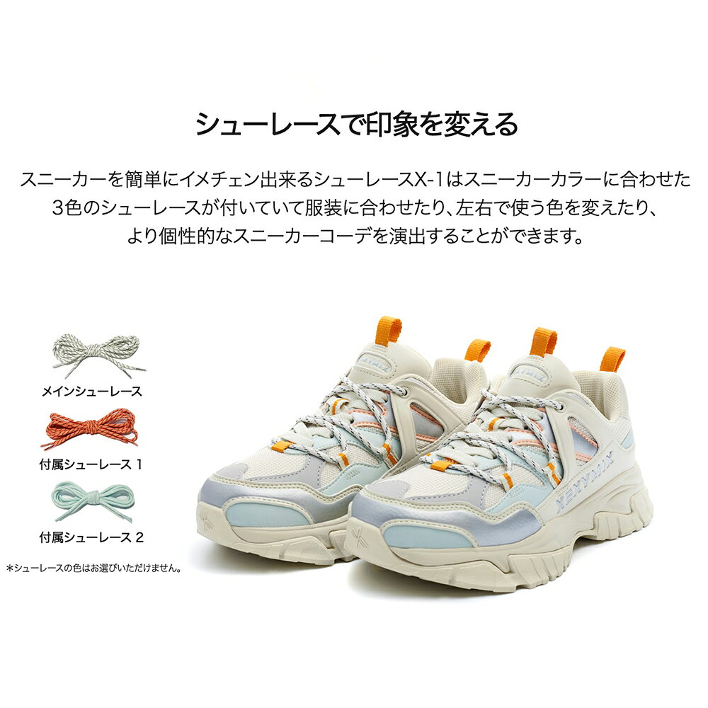 スニーカーカラーに合わせた3色のシューレースが付いていて 服装に合わせたり、左右で使う色を変えたり、 より個性的なスニーカーコーデを演出することができます。