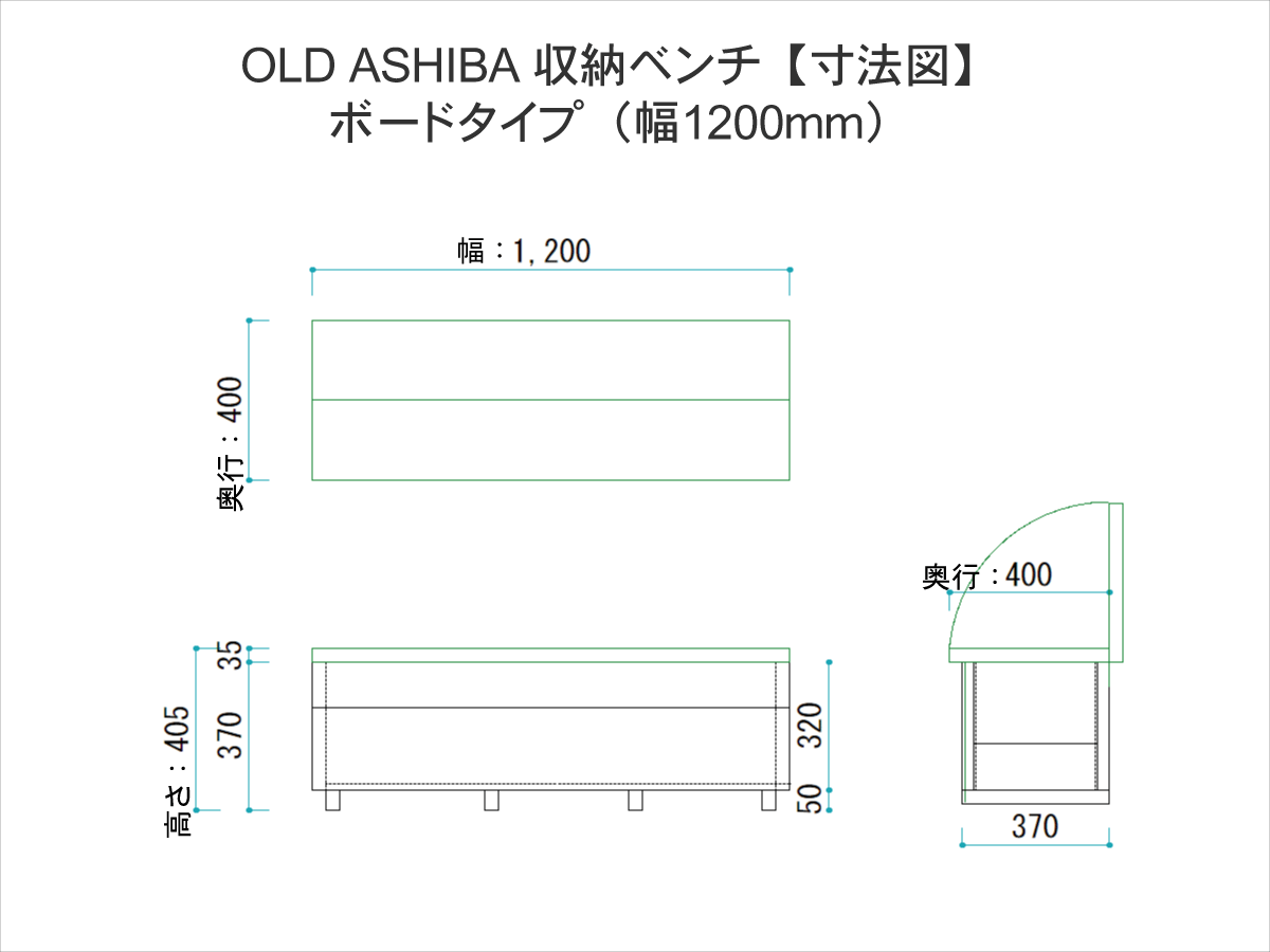 トップページ > OLD ASHIBA(足場板古材) > 収納ベンチ > 【ボードタイプ】幅1200mm 組立 不要(完成品でお届けします) サイズ 全体:幅1200mm×奥行400mm×高さ405mm (脚の高さ50mmを含む) 収納部内寸:幅1130mm×奥行300mm×高さ305mm 重量 約24kg 素材 OLD ASHIBA(足場板古材) >>素材について 色 無塗装 >>塗装仕上げ品はこちら その他 ・ソフトクローズの金具付きで収納扉がやさしく閉まる、お子様にも安心な仕様です。